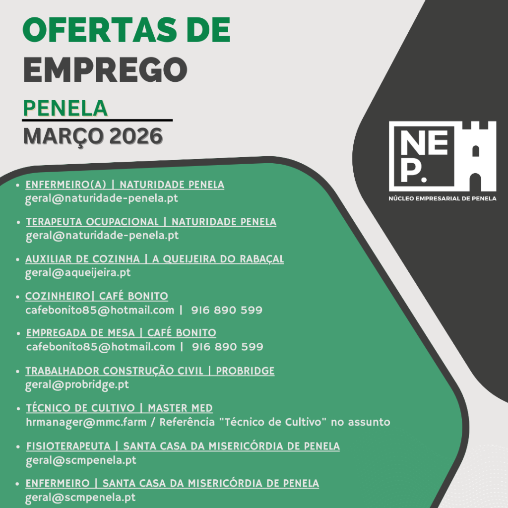 Categorias Notícias Ofertas de emprego – Março 2026 Autor do artigo Por Núcleo Empresarial de Penela Data do artigo Março 10, 2026 Sem comentários em Ofertas de emprego – Março 2026 Oportunidades de Emprego em Penela! Está à procura de novas oportunidades profissionais? Confira as vagas disponíveis no concelho de Penela e envie a sua candidatura diretamente às empresas! Para mais informações, consulte a imagem abaixo com os detalhes de contacto de cada empresa. ← Entrega de prémios das iniciativas de Natal 2025 → Inscrições abertas! I𝗻𝘁𝗿𝗼𝗱𝘂𝗰̧𝗮̃𝗼 𝗮̀ 𝘂𝘁𝗶𝗹𝗶𝘇𝗮𝗰̧𝗮̃𝗼 𝗲 𝗽𝗿𝗼𝘁𝗲𝗰̧𝗮̃𝗼 𝗱𝗲 𝗱𝗮𝗱𝗼𝘀 (𝗨𝗙𝗖𝗗: 𝟭𝟬𝟱𝟳𝟲) Deixe um comentário Cancelar respostaO seu endereço de email não será publicado. Campos obrigatórios marcados com *Comentário * Nome * Email * Site Guardar o meu nome, email e site neste navegador para a próxima vez que eu comentar.